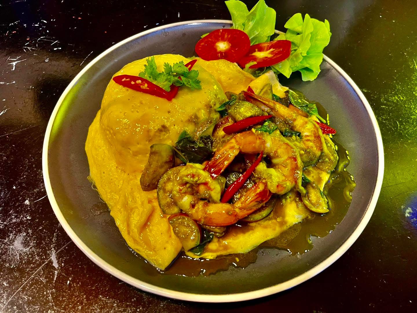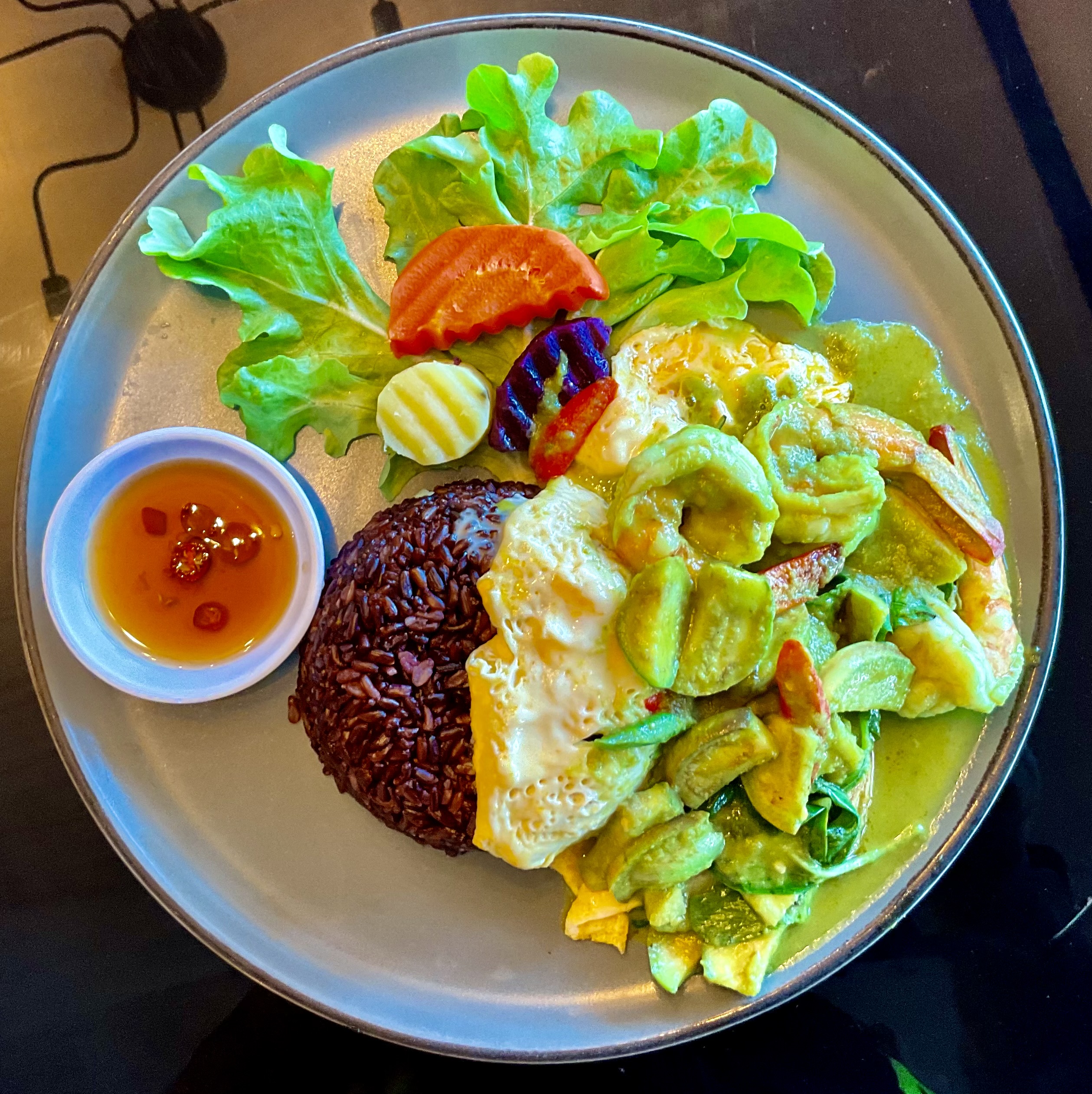ผัดเขียวหวานแห้งกุ้ง ไข่ข้นข้าวไรซ์เบอรี่