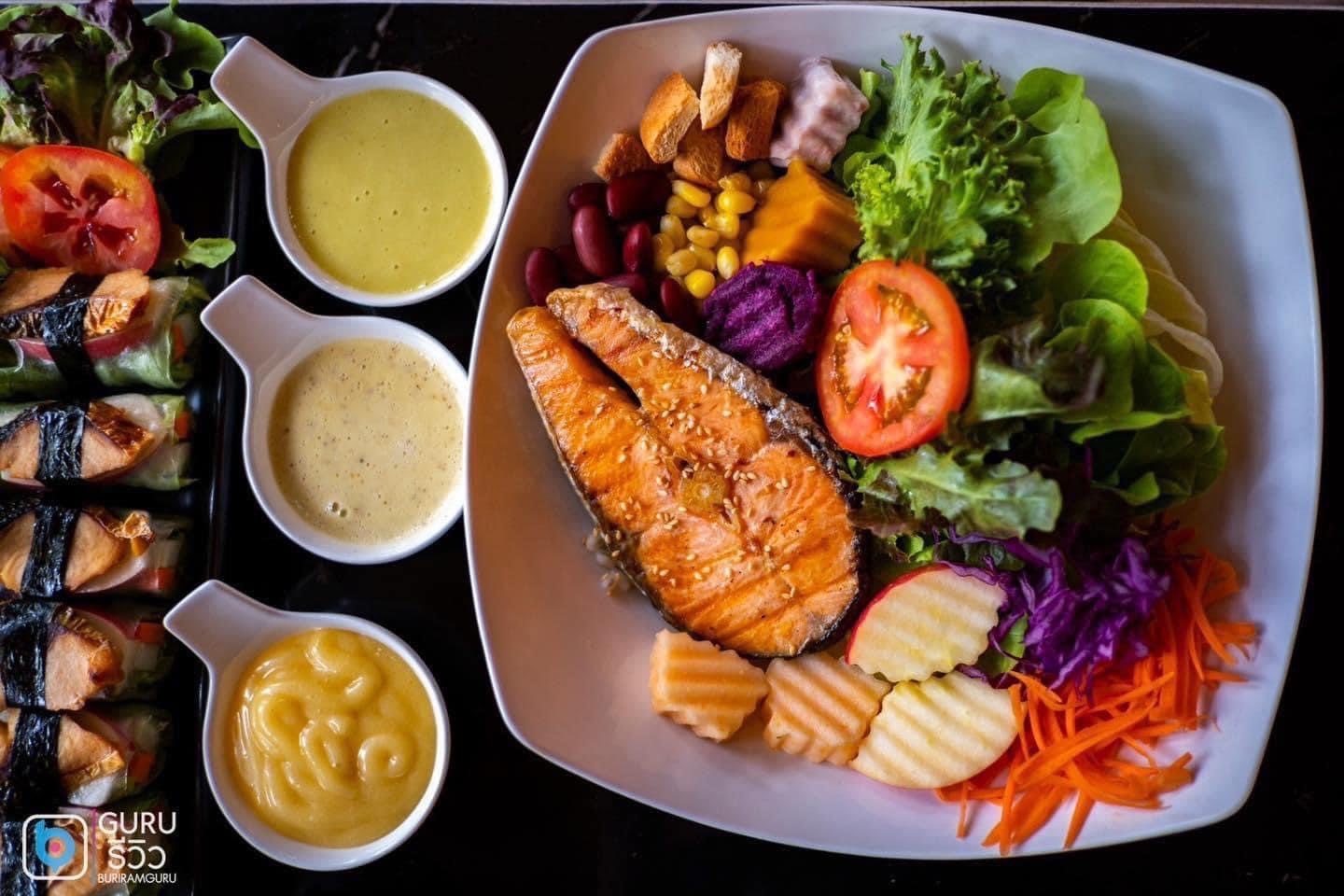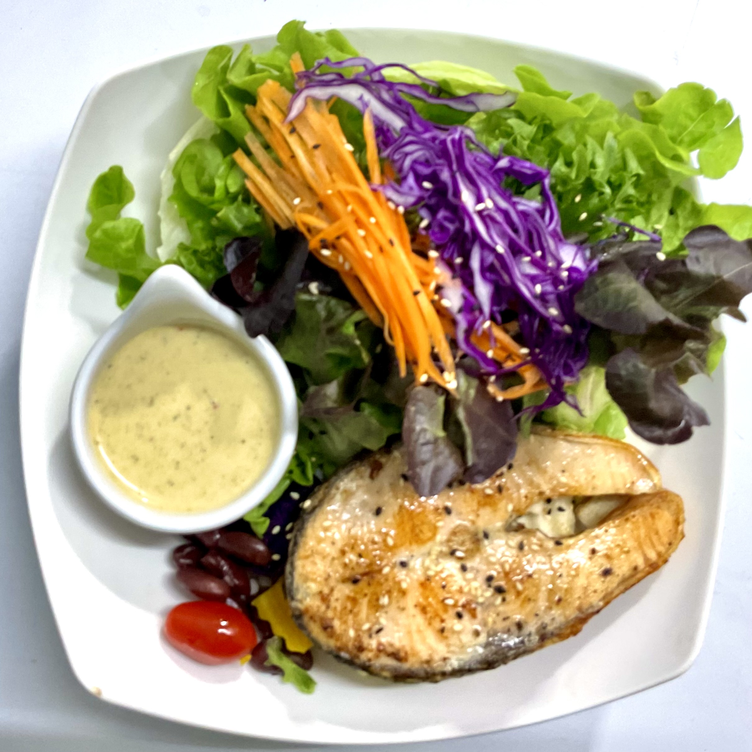 สลัดผักรวมธัญพืชปลาแซลมอนย่าง